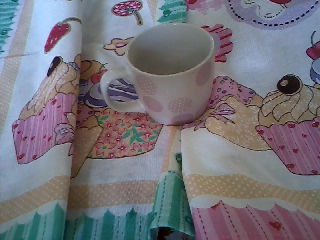 Comprei esses 2 panos de prato com motivos cupcakes na revista do Avon e essa caneca com motivos fofos.